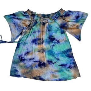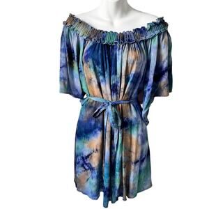 NEW Off Shoulder Tie Dye Dress Women Medium Tunic Blue Green Bell Sleeve Country