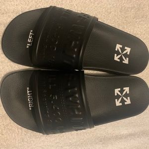 These Off-White pool slides are designed with a logo-embossed strap with signature industrial detailing. The footbed features a contrasting Arrows print and the words "left" and "right" to correspond with the “correct” foot. Black logo-embossed strap Branded footbed Slip-on style Open toe Flat sole Outer, Lining & Sole: 100% Polyurethane Made in Italy Available in Sizes: EU 39 & 40 Whole sizes only; for 1/2 sizes, order next size up Measurements, approx: Heel Height 0.8” Sole height. 0.6” BRAND NEW, UNWORN & IN ORIGINAL BOX Comes with branded dust bag Tags: Virgil Abloh, Pool Slides, Flip Flops, Embossed, Resort, Beach, Pool, Vacation