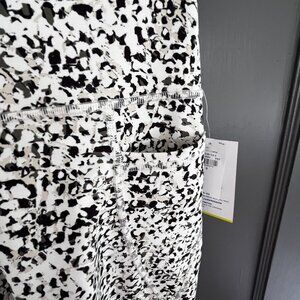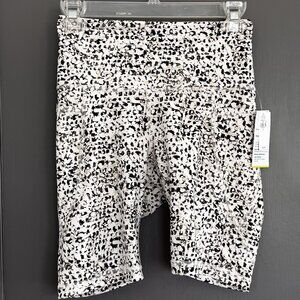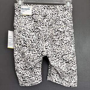 New with tags (NWT) Old Navy Active Powersoft Bermuda Shorts in women's size Small (S). These stretchy athletic shorts have an 8-inch inseam and 24" waist. They feature two pockets - one on each side. The pattern is a white, beige and black abstract, granite-like design.