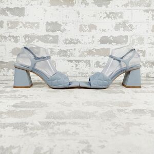 A quilted woven vamp strap is complemented by a slim ankle strap giving both texture and sleek style to a square-toe sandal set on a high block heel.