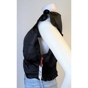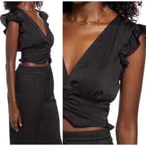 NEW Open Edit Ruffle Ruched Satin Crop Top Large Black Deep V Flutter Sleeve