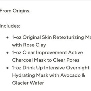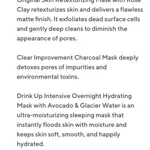 Masking trip to retexturize, purify and hydrate. Includes a 1 ounce tube of Original Skin, Clear Improvement and Drink Up Intensive. New in beautiful box as shown.