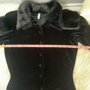 New without tags Gorgeous Vintage Black Velour Faux Fur Trimmed Long Sleeve Button Front Stretch Shirt Jacket by C.C. Outlaw. Oversized Trimmed Collar and Cuffs. Soft, Comfortable, and Stretchy. Covered Buttons. Mid Weight. Women’s Size Small. Vintage.