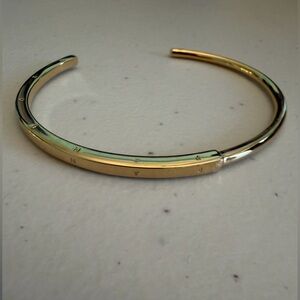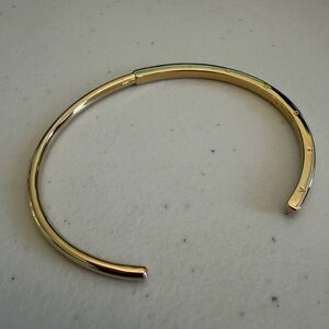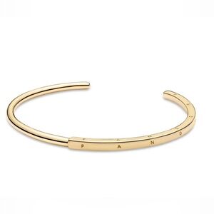 Streamline your look with the Pandora Signature I-D Bangle. With a half-squared, half-rounded profile, this bangle is hand-finished in 14k Gold-plated metal. The round polished profile transitions to a larger squared profile in the middle, which features the Pandora logo on its three outer sides. Each end of the bangle includes the Pandora Crown O monogram. The bangle is precisely sized for optimal performance and fit and is not designed to be flexed and twisted when put on and removed.