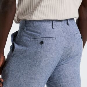 Comfortable and stylish blue linen blend trousers - perfect for any occasion. Breathable. Sit below the waist. Slim fit. Flat front. Back welt pockets. Professional or casual wear.