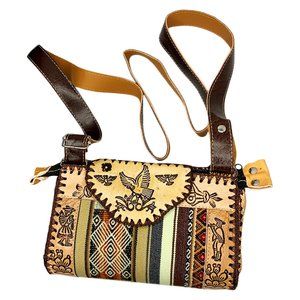 NEW PERU CUSCO WOMEN'S TEXTILE FABRIC EMBOSSED LEATHER BOHO PURSE CROSSBODY BAG