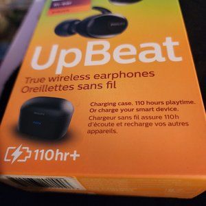 NEW NEVER USED IN ORIGINAL PACKAGING PHOLIPS UP BEAT TRUE WIRELESS EARPHONES. BLUETOOTH 5.0; 5+110 HRS. BATTERY; POWERFUL SOUND; COMFORT FIT; MIC AND CPNTROL. EARPHONES ARE BLACK WITH SIMILAR CHARGING CASE. MSRP $79.