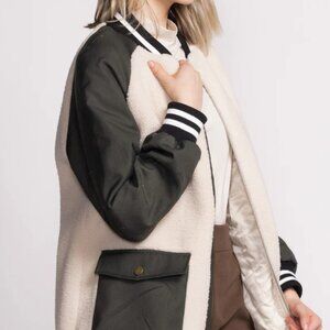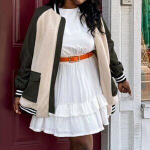 The Marlene Bomber Jacket, in green and cream, is your go-to fall fashion statement. This chic piece effortlessly layers with any outfit, making it a versatile addition to your seasonal wardrobe.