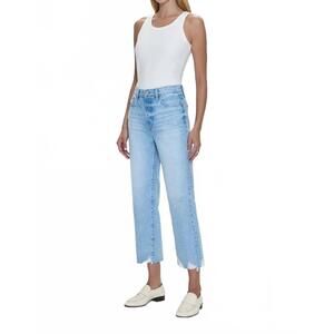 Introducing the Cassie Crop Super High Rise Straight Denim by PISTOLA in a soft Leisure Vintage wash. These jeans feature a super high rise with a 12-inch rise and a composed straight leg designed to define your silhouette. Crafted from a premium blend of 77% Cotton, 22% Tencel, and 1% Spandex, they offer a structured, non-stretch fit that molds to your body and includes a 26-inch inseam and frayed hem. Closure is a button type, while care is straightforward with machine wash and tumble dry instructions. Model is 5’9” wearing size 26 with a 16-inch leg opening.
