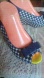 Features a navy blue and polka dot pattern with yellow accents on the insole and sole, and a navy blue bow detail.