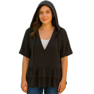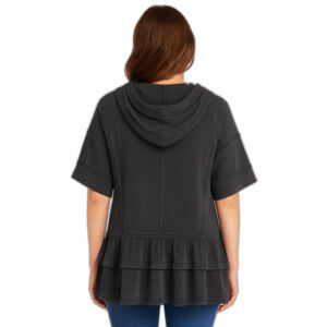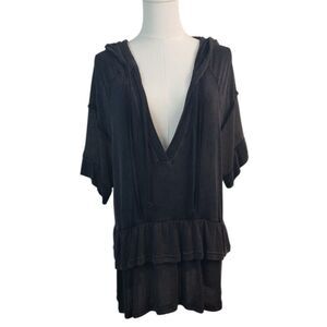 NEW POL Oversized Small Charcoal Gray Hooded Top Raw Seams Short Sleeves Ruffles
