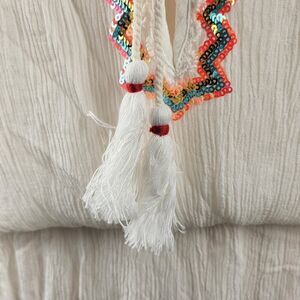 NEW POL Small Off-White Crinkled Cotton Blouse Embroidered Tie Tassels BOHO