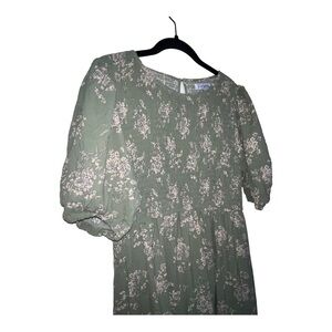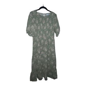 NEW POLAGRAM Sage Green Floral Puff Sleeve Smocked Tiered Midi Dress Large