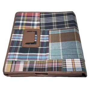 NEW POLO RALPH LAUREN Patchwork Madras Plaid & Leather Tablet Cover! Navy Brown