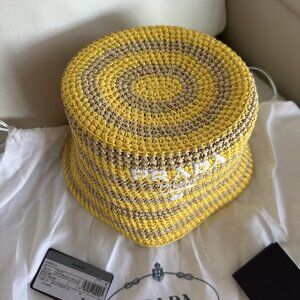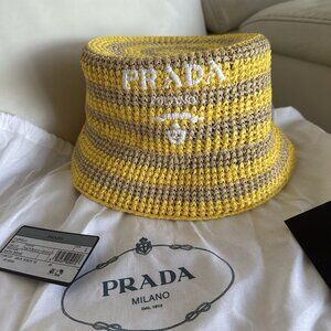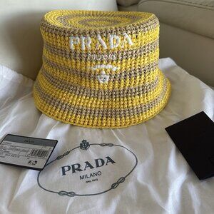 NEW PRADA Raffia Striped Logo Embroidered Womens Bucket Hat S Naturale Giallo