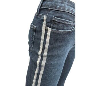 * Features: 5 pocket structure, belt loops, zip button front closure. The Color is dark wash indigo with a silver metallic tux racing stripe down the side. The fit is soft, stretchy, high-rise, and slightly looser at the ankles than traditional skinnies.