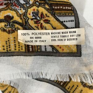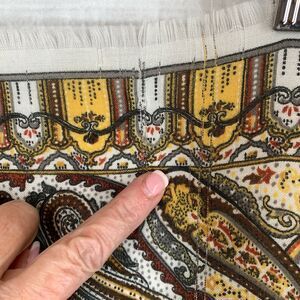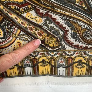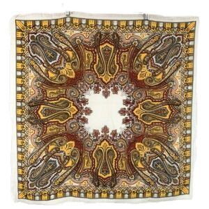 New paisley print square scarf with fringed edges. It's gold and brown on an ivory background. The fabric is very soft and semi-sheer, it feels like fine cotton, but it's polyester. Very silky. About 30" square. There are a few small pulls, but the patten hides them. Made in Italy! New with tag, as shown.