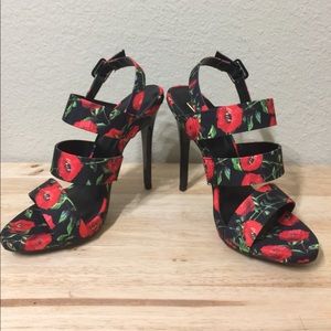 🌺A strappy statement heel that features a romantic red rose print, an open toe and buckled sling back strap. Exposed heel. Small platform. Cushioned insole. Wrapped stiletto heel.