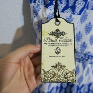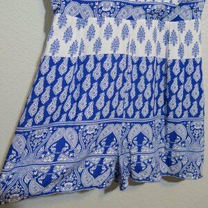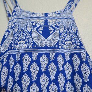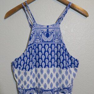 Floral paisley blue and white romper by Parisian Collection, back criss cross detail, adjusting straps, high neck, back zipper. New with tags, excellent condition