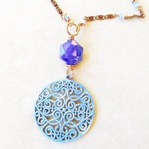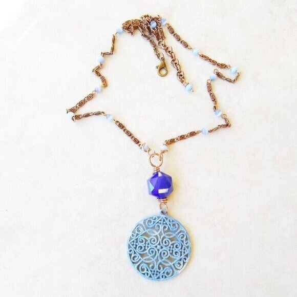 I hand painted the filigree medallion in several layers of white + blue patina paint, to create a bit of a washed out, shabby chic appearance. Topped it with a beautiful kobalt blue faceted glass bead, and then decided to embellish the ornate "Greek Key" copper chain by adding pale blue Catseye Beads for more visual interest. The blue colors all go beautifully together - as they are all from the same color family. The overall impression is a softly, well loved beachy or coastal vibe!