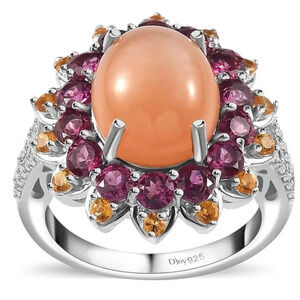 Juicy peach moonstone with raspberry rhodolite garnets , citrine gemstones and white zircon accent stones. Print set in platinum over sterling silver. Citrine has been heat treated. Size 7. 925 Djoy . 8.10 total ctw