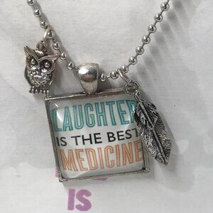 New Pendent necklace comes with a 1" square pendent that says "Laughter is the best medicine". It also has 2 charms; an owl and a feather. Comes with a silver tone 18 inch chain. Comes on a display card in a cellophane bag.