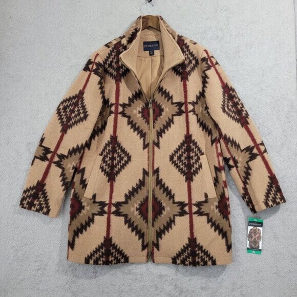 NEW Pendleton Womens XL Aztec Print Wool Walker Coat Zipper Front Beige