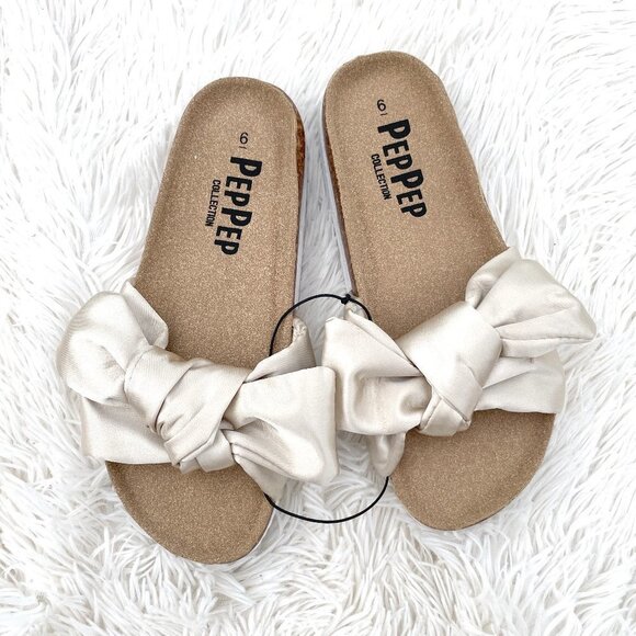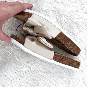Brand new and unworn! PepPep Collection adorable cork slides-ons with cream satin bow. No box. Suede with memory foam. So comfy! Low platform.