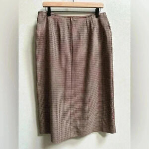 Brand new with tags from luxury Italian designer Marina Rinaldi. This Cammino Plaid Houndstooth piece is beautifully crafted in Italy and features a refined pencil silhouette with a rich brown, black, red, and white plaid design. Its timeless midi length makes it perfect for polished professional settings, chic fall layering, or elevated winter outfits. A true quiet luxury piece, it seamlessly blends elegance and sophistication, making it an ideal addition to a capsule wardrobe built on versatile, high-quality staples.