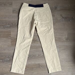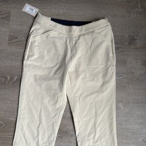 These innovative women's pants are made from a stretch performance blend, with details like elastic at the back waist, zipper side entry and a tab waist. They sit comfortably just above the waistline with a gentle contour for an elegant shape. Finished with quarter-top side pockets, back jean patch pockets and a notched ankle hem. A true performance pant that excels on the course and beyond.