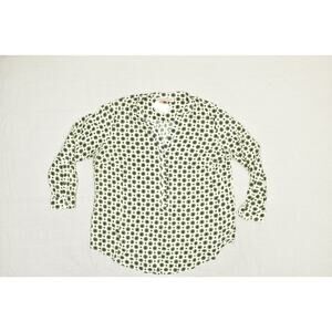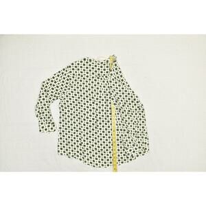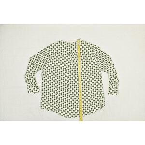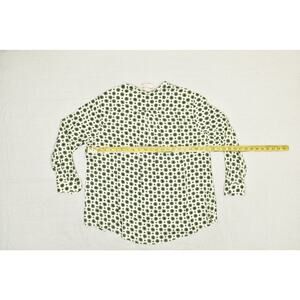 This is a stylish Philosophy Woman printed blouse, new with original tags attached. This tunic-style top features a unique ivory multi-color print with a subtle geometric-style pattern. The blouse is a Plus Size 2X and is made of 100% Viscose, offering a lightweight and comfortable feel. It has a V-neckline with a partial button-down closure and long sleeves with buttoned cuffs. The curved hemline adds a touch of elegance. This versatile blouse is perfect for a variety of occasions, from casual outings to professional settings. The armpit-to-armpit measurement is approximately 25 inches, and the length from shoulder to hem is approximately 28 inches. All measurements are provided for an accurate fit. Please refer to the photos for a detailed view of the item and its condition.