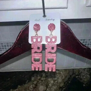 These are new, pink glitter "Bride" earrings. The earrings are made of metal and have a pink glitter finish. They are approximately 2.5 inches long and have a post back closure. The earrings are in excellent condition and have no visible imperfections. They are perfect for a bride-to-be or anyone who wants to add a touch of sparkle to their outfit.