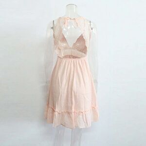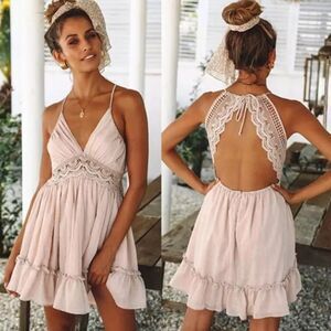 This dress features stunning crochet lace in a pretty dusty pink color. The top has a triangle shape with scalloped crochet lace details around the bust. Stunning open back with the same pretty crochet lace. Self tie closure at the back of neck. Stretchy elastic waist. No closures; it just slips on.