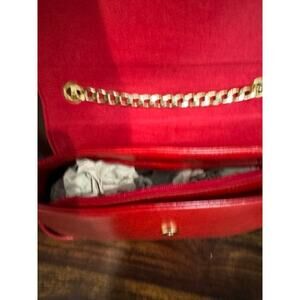 This adorable pink Haley crossbody bag is perfect for date night, girls' night, or Valentine's Day! The cute design features a red faux leather exterior with a black heart detail on the flap and a magnetic front closure. The bag has red trim on the sides and bottom, adding a pop of color. The chain strap with a shoulder hold allows the bag to be worn as a crossbody. Inside, you'll find a zipper pocket and two additional accessory pockets for organization.