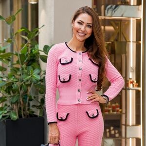 The Pink Tweed Knit Set makes a chic and feminine statement with its modern silhouette and elegant detailing. The long-sleeve button-front cardigan is designed in a soft pink knit with bold black contrast trim and faux pocket accents, offering a polished, tailored feel. Paired with matching high-rise wide-leg pants featuring coordinating contrast-trimmed pockets, this two-piece outfit blends sophistication with all-day comfort. Crafted from stretch knit fabric, it’s versatile enough for daytime elegance or elevated evening wear.