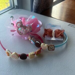 Set of two headbands. One pink with a large bow and sequins. One blue with floral charms. Perfect for adding a playful touch to any outfit.