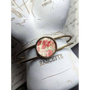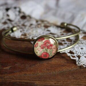 This simple, handmade cuff bracelet has a vintage-inspired image of pink and red poppy flowers with an antiqued-bronze finish. The image is reversed decoupage under a 20mm glass cabochon, which is about the size of a quarter. This bracelet can be worn throughout the year, with particular appeal during the spring and summer. Made in the United States.