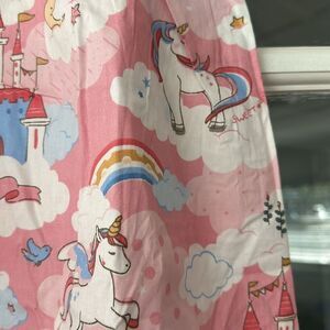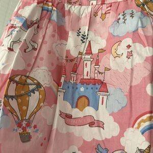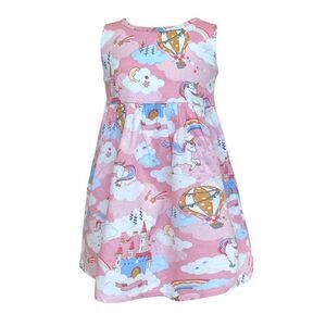 Adorable pink dress featuring unicorns, castles, and hot air balloons. Perfect for a whimsical look.