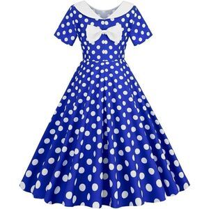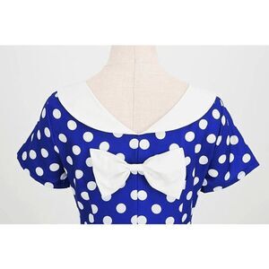๐ NEW Pinup Retro 1950s Shawl Collar Bow BackโBlue Polka Dot Tea Dress SIZE XL