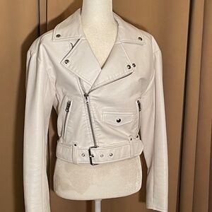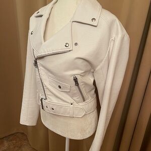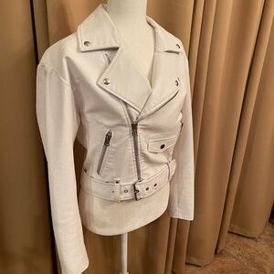 Beautiful jacket. Brand New without Tags. Never Worn.. This modern take on the moto jacket features an asymmetrical zip and unexpected off-white hue. The epaulets and metal press studs offer heaps of attitude to this cropped classic, while the vegan leather makes it an easy choice. Style it with sleek leggings for an edgy look, or use it to toughen up a floaty dress, jeans or pants.