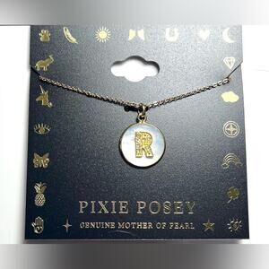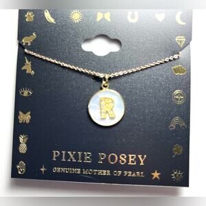 NEW Pixie Posey 18kt gold plate MOP disc & crystal initial "R” PENDANT NECKLACE