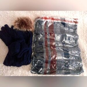 NEW Plaid Knit Blanket Scarf, Touchscreen Gloves & Pom Beanie Set