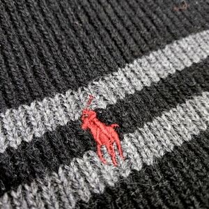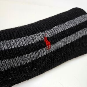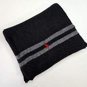 Polo Ralph Lauren knit rectangle scarf. Solid black with gray stripe details on ends. Red embroidered logo. Unisex syle.