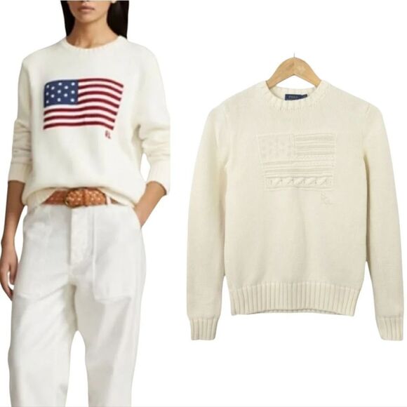 NEW Polo Ralph Lauren Iconic Embroidered American Flag Sweater in Ivory Size S