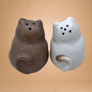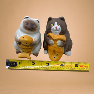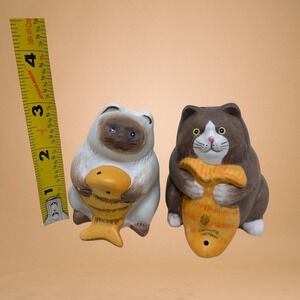 NEW Pottery Kitty Cat Salt & Pepper Shaker Set with Fishes Siamese Tuxedo Chunky