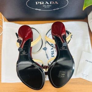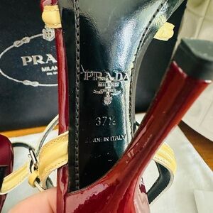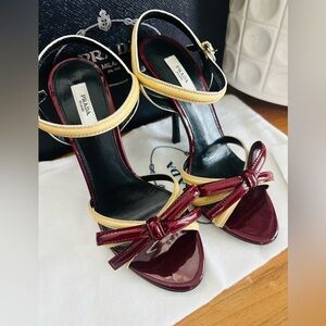 Brand new chic Prada heels with a burgundy and gold design. Elegant straps and sleek finish. Perfect for any occasion and comes with the box and dust bag.