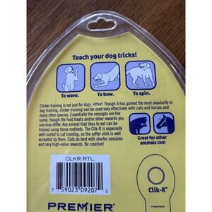 Great clicker tool for positive reinforcement dog training. This ergonomic Premier Clik-R features an easy-press button and comfort finger band to help teach your dog manners and tricks like sit, stay, wave, bow, and more. Also useful for training cats and other animals. New and sealed in original packaging.