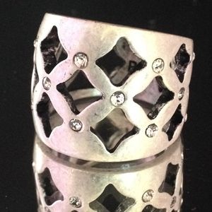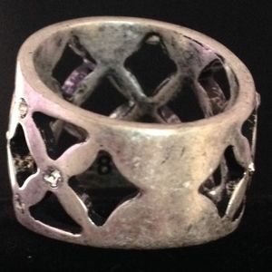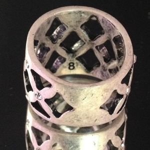 It is antiqued matte silver tone with small clear crystal accents. The unique finish has been perfectly "imperfected" to achieve a uniquely worn in sterling silver look. Please note, we have more than one of this style available. The ring received may be ever so slightly different in the oxidized markings. Each one is unique.