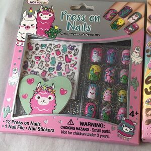 This set includes 12 press on nails, 1 nail file, and 1 sheet of nail stickers.