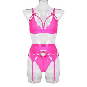 This 3 piece lingerie set includes a matching bralette; undies & garter. It has a hot pink color, because everyone looks pretty in pink! The bralette has strappy cut outs & bows. Adjustable straps & hook closure in back. The undies have the same front cut outs, a bow in the center & the most fabulous heart cut out in back! Cheeky coverage. The garter has the same heart cut outs & adjustable straps that clasp to stockings.
